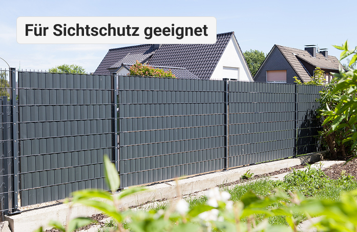 Durch das Doppelstabgitter können Sichtschutzstreifen einfach durchgezogen werden. Dadurch entsteht ein kompletter Sichtschutz.