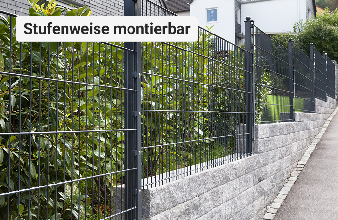 Die Längen der Zaunelemente können halbiert werden, und durch die Verwendung zusätzlicher Zaunpfosten kann eine schnellere Anpassung an Gefälle erfolgen, ohne dass am Boden ein zu großes Loch (Dreieck) entsteht. Zusätzlich besteht die Option, die Doppelstabmatten im Verlauf des Gefälles zu installieren, indem unser Pfostentyp U verwendet wird und die Gittermatten miteinander verbunden werden.