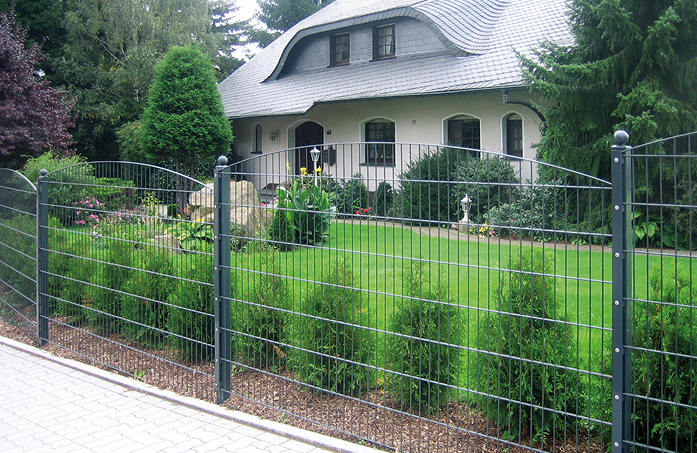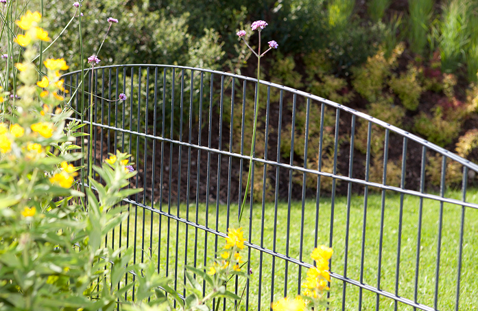 Der Bogenschmuckzaun SYDNEY besteht aus hochwertigem Doppelstabgitter und massiv miteinander verschweißten Stahldrähten mit einer Drahtstärke von 6 mm waagerecht und 6 mm senkrecht. Sie können den Schmuckzaun SYDNEY in den Höhen 806 mm, 1006 mm und 1206 mm erhalten.