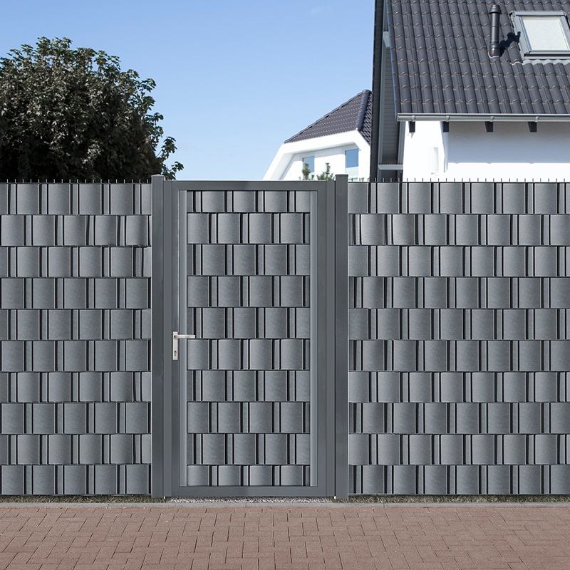 Ein Gartentor muss nicht einsehbar bleiben, nur weil es als Durchgang gedacht ist. Sichtschutz lässt sich bei vielen Modellen einfach ergänzen, ohne das bestehende System zu verändern. Das heißt: Sie müssen sich nicht sofort für einen Sichtschutz entscheiden und können Ihr Tor später ergänzen. Bei allen Gartentoren mit Doppelstab-Füllung können Sichtschutzstreifen direkt in das Gitter eingefädelt werden. Die Streifen schließen die offenen Flächen und erhöhen den Sichtschutz, ohne dass das Tor ausgetauscht werden muss. Wer von Anfang an eine geschlossene Ausführung möchte, kann über VARIO pro auch Füllungen mit Holz oder Blech einplanen.