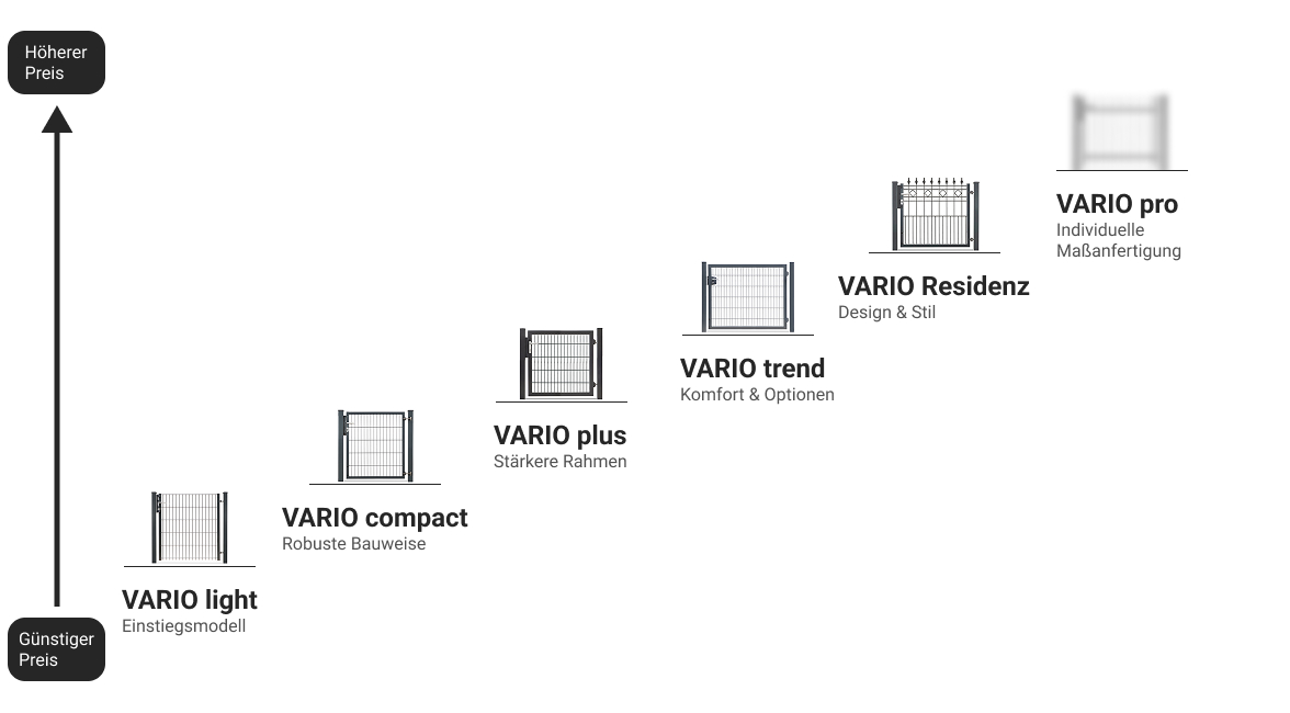 | Tore für Schmuck- & Schmiedezäune | Serie VARIO Residenz | Stahl, feuerverzinkt / pulverbeschichtet | 1020 - 1170 mm | 800 - 2000 mm | Zink, Anthrazitgrau RAL 7016, Moosgrün RAL 6005 | Durch Design & Stil etwas höherer Preis |