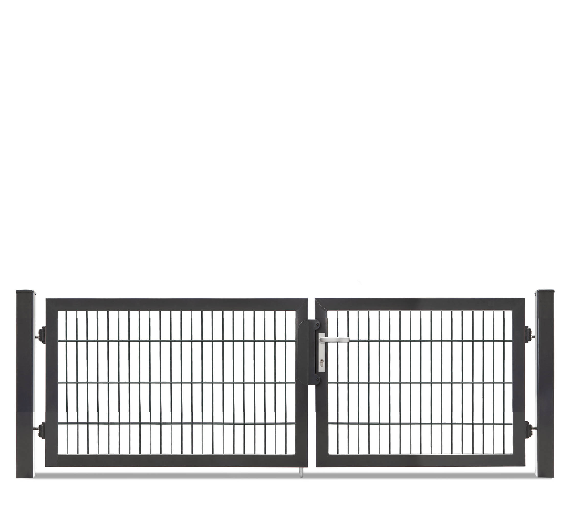 Die zweiflügelige Variante ist in sieben Breiten und sieben Höhen erhältlich, als zweiflügelige Toranlage bieten sich sowohl symmetrische als auch asymmetrische Kombinationsmöglichkeiten. Das Tor ist feuerverzinkt und pulverbeschichtet in RAL 7016 ab Lager verfügbar.