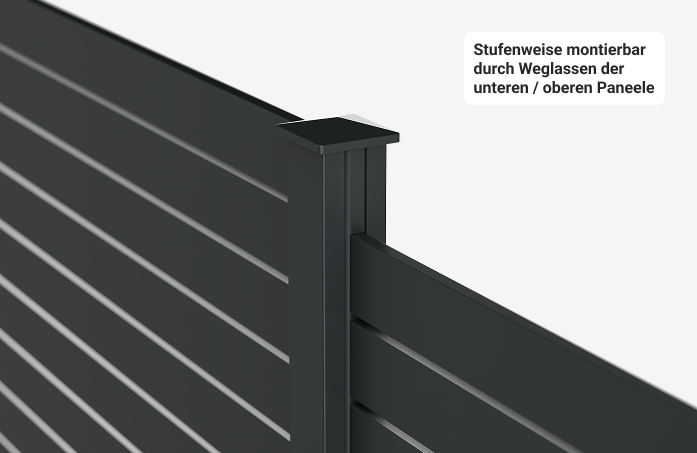PaneeleDie Zaunfelder bilden die sichtbare Fläche und werden in das System eingeschoben oder eingeklickt. -