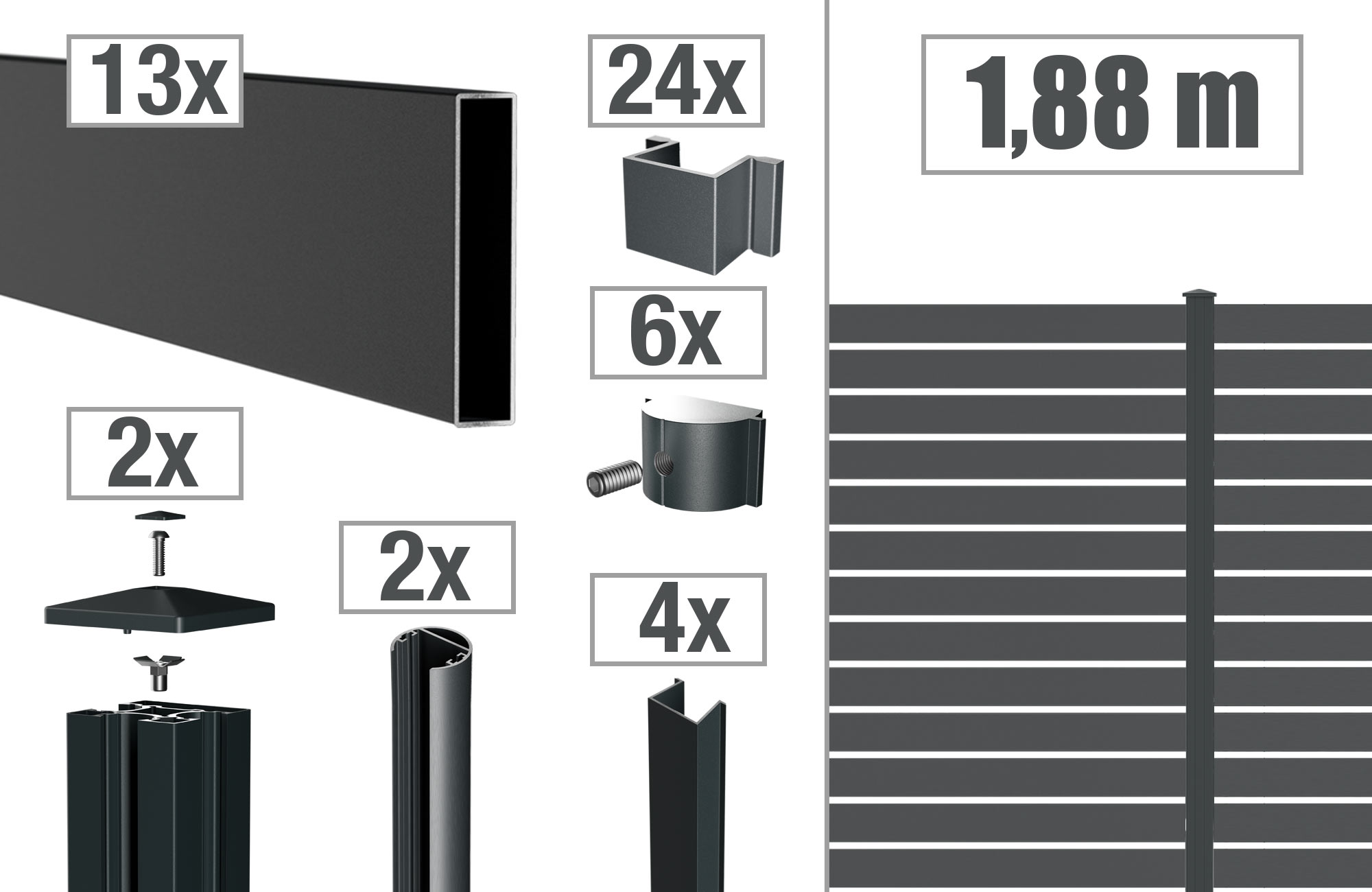 Das Aluminium-Rechteckprofil der VIDUAL Steckzaunserie bietet eine hochwertige und zeitlose Optik und zeichnet sich durch seine Spaltenhöhe von 18 mm aus. Das Profil ist in der Größe 1730 x 100 x 20 mm erhältlich und wird in RAL 7016 Anthrazitgrau Feinstruktur pulverbeschichtet geliefert. Das Zaunpaket besteht aus folgenden Komponenten: