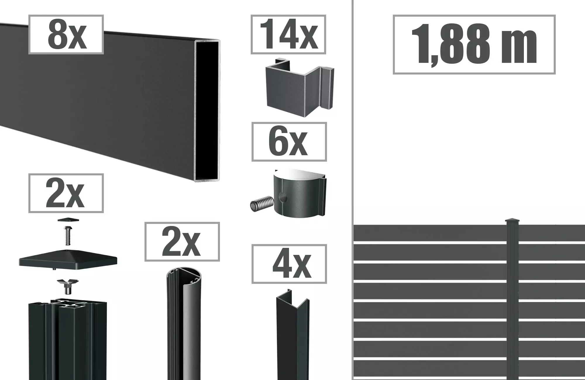 Das Aluminium-Rechteckprofil der VIDUAL Steckzaunserie bietet eine hochwertige und zeitlose Optik und zeichnet sich durch seine Spaltenhöhe von 18 mm aus. Das Profil ist in der Größe 1730 x 100 x 20 mm erhältlich und wird in RAL 7016 Anthrazitgrau Feinstruktur pulverbeschichtet geliefert. Das Zaunpaket besteht aus folgenden Komponenten: