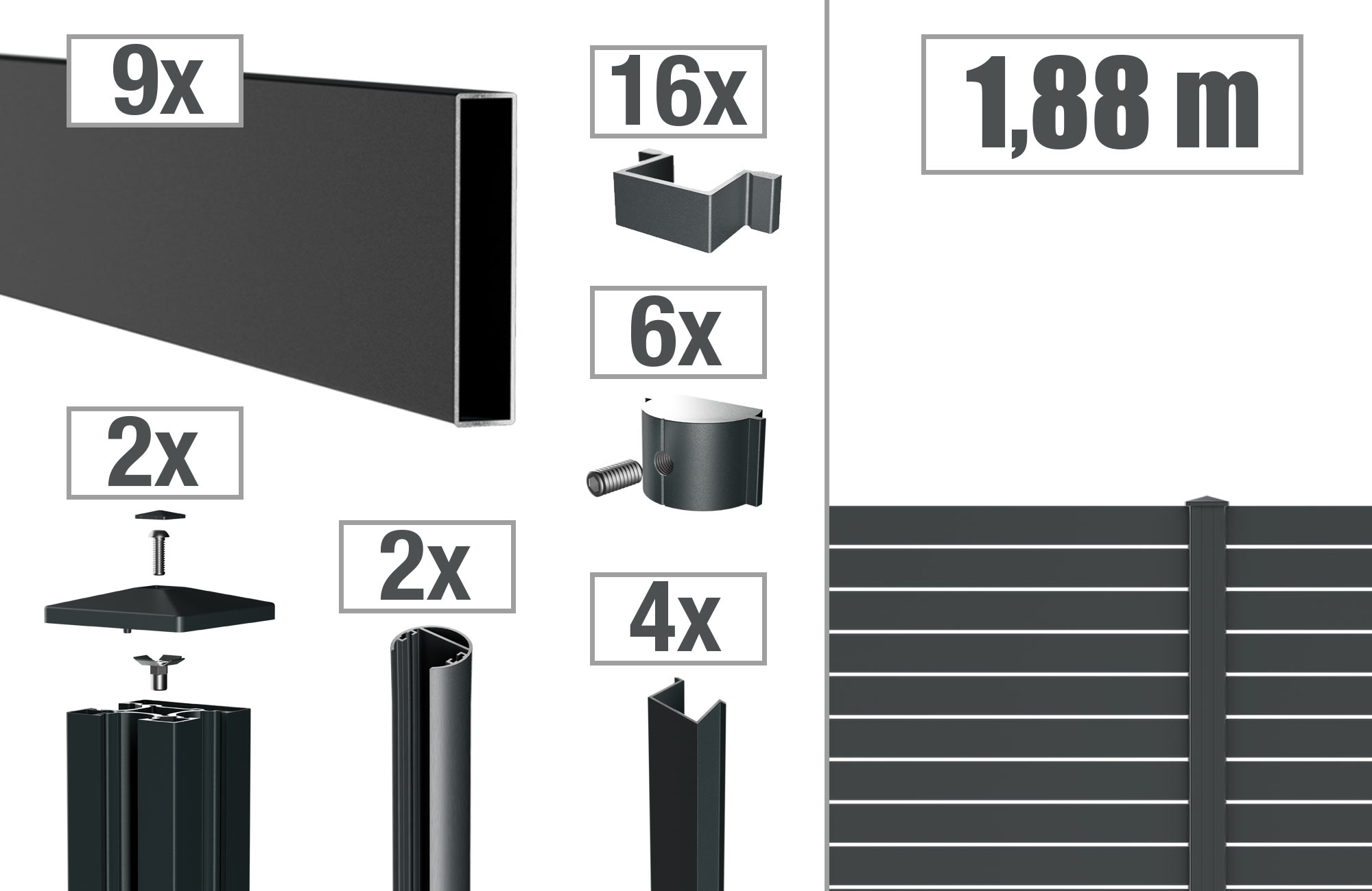 Das Aluminium-Rechteckprofil der VIDUAL Steckzaunserie bietet eine hochwertige und zeitlose Optik und zeichnet sich durch seine variablen Spaltenhöhe von 10 mm aus, die durch das Einsetzen entsprechender Distanzstücke erreicht werden. Das Profil ist in der Größe 1730 x 100 x 20 mm erhältlich und wird in RAL 7016 Anthrazitgrau Feinstruktur pulverbeschichtet geliefert. Das Zaunpaket besteht aus folgenden Komponenten: