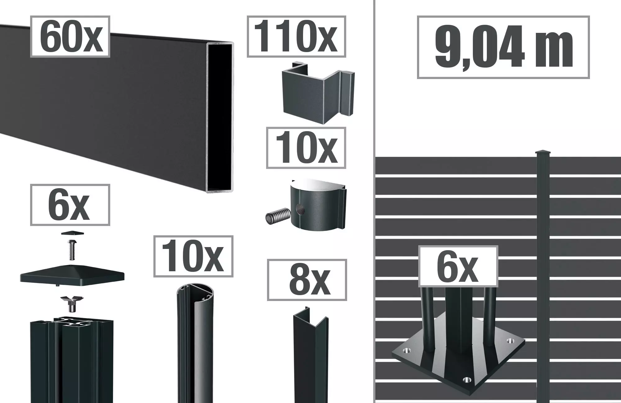 Das Aluminium-Rechteckprofil der VIDUAL Steckzaunserie bietet eine hochwertige und zeitlose Optik und zeichnet sich durch seine Spaltenhöhe von 10 bzw. 18 mm aus. Das Profil ist in der Größe 1730 x 100 x 20 mm erhältlich und wird in RAL 7016 Anthrazitgrau Feinstruktur pulverbeschichtet geliefert. Das Zaunpaket besteht aus folgenden Komponenten: