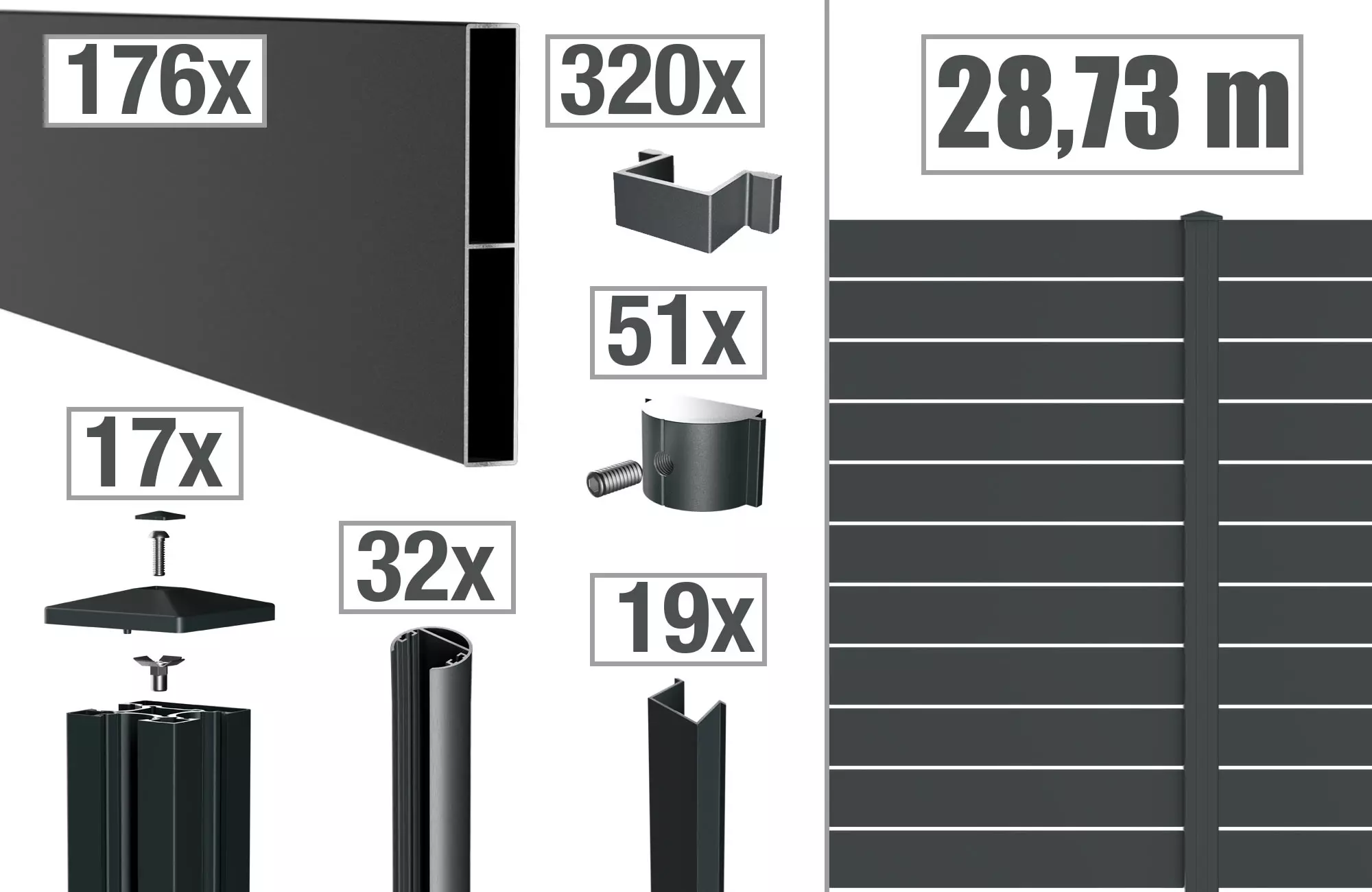 Das Aluminium-Rechteckprofil der VIDUAL Steckzaunserie bietet eine hochwertige und zeitlose Optik und zeichnet sich durch seine Spaltenhöhen wahlweise von 10 bzw. 28 mm aus. Das Profil ist in der Größe 1730 x 150 x 20 mm erhältlich und wird in RAL 7016 Anthrazitgrau Feinstruktur pulverbeschichtet geliefert. Das Zaunpaket besteht aus folgenden Komponenten:
