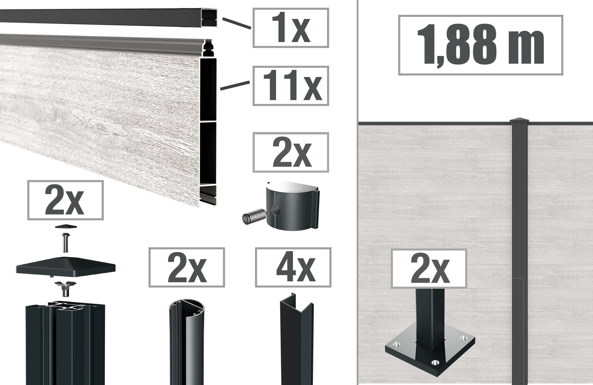 - Variante zum Aufdübeln: inkl. Fußplatten 90x90 mm bzw. 150x150 mm (ab Höhe 1400 mm)