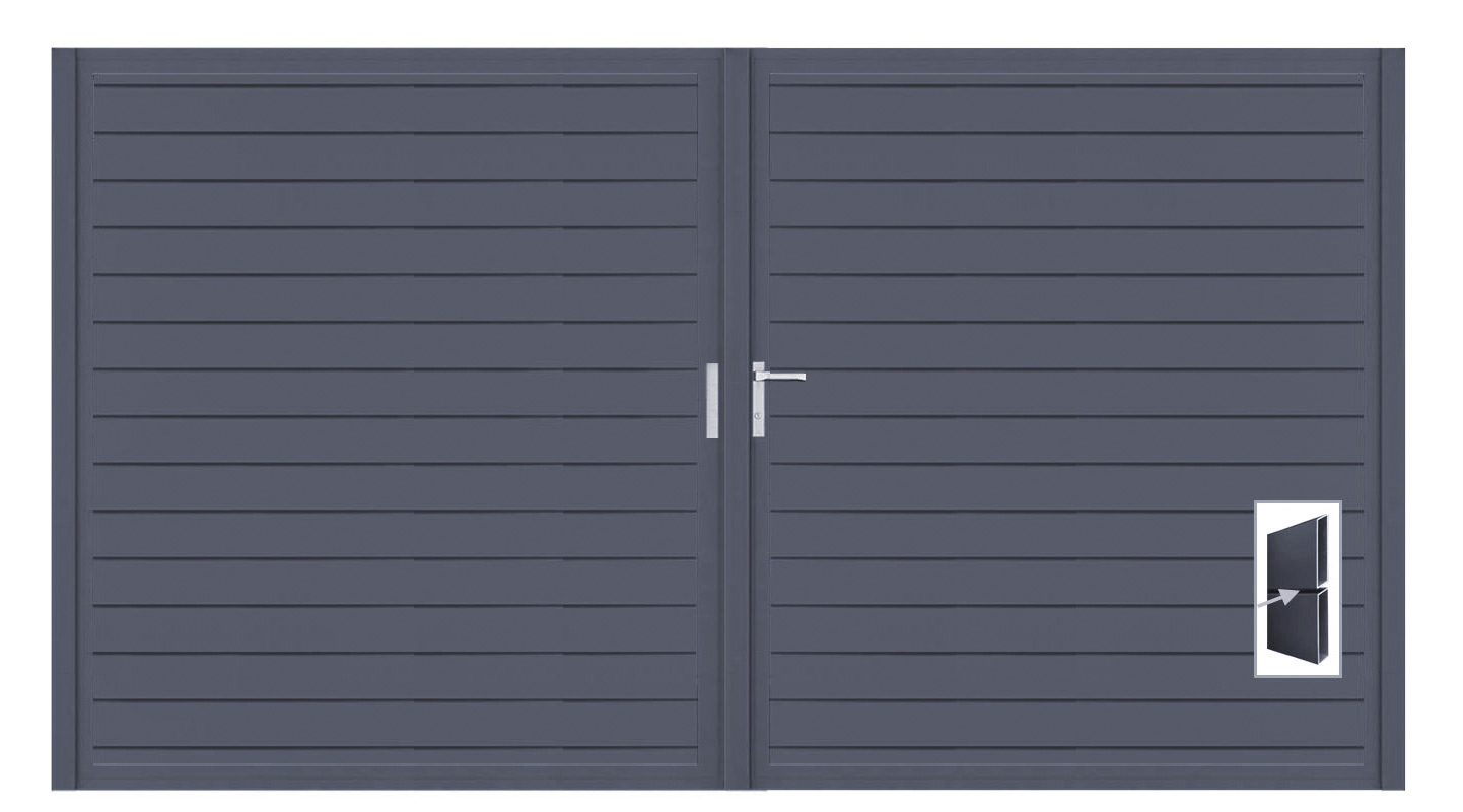 Damit ist ein zweiflügeliges Einfahrtstor mit einem schmalen und einem breiten Flügel gemeint. Der schmale Flügel dient als Durchgang für Fußgänger, ohne dass das gesamte Tor geöffnet wird. Wenn ein Auto durchfahren soll, öffnen Sie beide Flügel und nutzen die volle Breite. Sie finden diese Aufteilung zum Beispiel bei VARIO trend und VARIO plus.