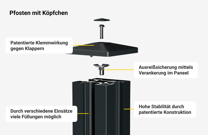 Unsere Pfosten werden von einer pyramidenförmigen Spitze abgeschlossen. Sie sorgt für eine saubere Optik und verleiht dem gesamten Zaunsystem eine hochwertige Wirkung. Möglich wird das durch die patentierte Klemmwirkung, die die Elemente sicher zusammenhält. Eine durchdachte Lösung für alle, die Wert auf Stabilität und ein stimmiges Design legen. Eben eine Lösung mit Köpfchen.