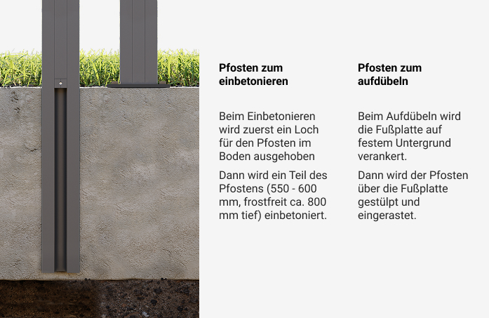 Damit der Aufbau leicht gelingt, liegt jedem Zaunpaket eine ausführliche Montageanleitung bei. Schritt für Schritt zeigt sie Ihnen, wie Sie Ihren neuen Zaun perfekt montieren. Vom Setzen der Pfosten über das Einstecken der Profile bis zum exakten Ausrichten der Abdeckleisten. Die Pfosten können entweder einbetoniert oder auf einem festen Untergrund verschraubt werden. Beides ist mit dem System problemlos möglich.