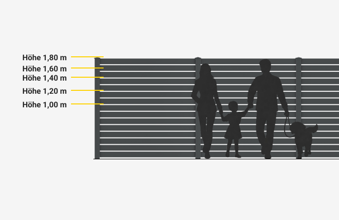 Ein Zaun erfüllt unterschiedliche Aufgaben und prägt den ersten Eindruck Ihres Zuhauses. Manchmal geht es um klare Abgrenzung, manchmal um Sichtschutz oder einfach um eine stimmige Gestaltung. Bei uns finden Sie zu allen Aluminiumsteckzäunen verschiedene Zaunhöhen, die sich an Haus, Garten und Nutzung orientieren. Alle Höhen lassen sich innerhalb des Zaunsystems flexibel kombinieren und fügen sich harmonisch in das gewählte Design ein. Auf diese Weise entsteht ein Zaun, der nicht nur gut aussieht, sondern auch Ihren Wünschen entspricht.